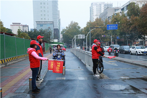 11月8日一大早,瑟瑟秋雨中,郑州市管城街商城路口出现了一道亮丽的风景线:一批头戴“小红帽”、身披“文明交通志愿者”马甲,手拿文明出行旗子的青年党员志愿者,不畏冷雨,正在忙碌地配合交警、交通协管员维持交通秩序,劝阻交通违章行为,引导市民遵守交通规则,倡议文明出行。