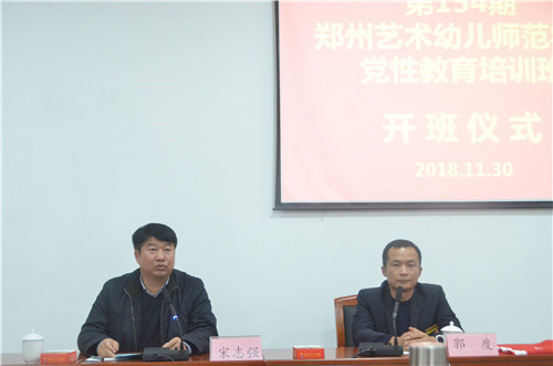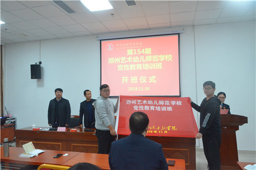 11月30日下午14:30,开班仪式在综合楼报告厅启动。南水北调干部学院教务科科长郭度同志向学员们阐释了党性教育的含义及重要性,论述了党校与干部学院的差异,讲解了南水北调干部学院的办学特色。郑州艺术幼儿师范学校党总支书记、校长宋志强致辞并对参加培训班的党员同志提出学习上的要求。随后,两名党员接受此次培训班班旗,培训班正式开班。