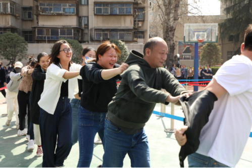 比赛现场热闹非凡,笑声不断。“一会我们讲好战术,你左我右”“一定把口号喊响亮!”还未上场的教师认真观看上场的参赛队伍,总结战术经验,信心满满地准备应战。