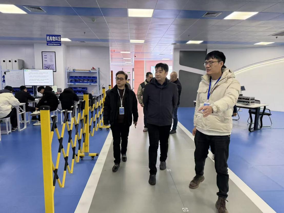在优佳智培高端技能人才培就基地和迅捷人工智能科技有限公司,谢涛一行参观了机构物料区、机器质检区,机器人应用一体化实操台等详细了解企业发展和在智能制造领域的应用情况。